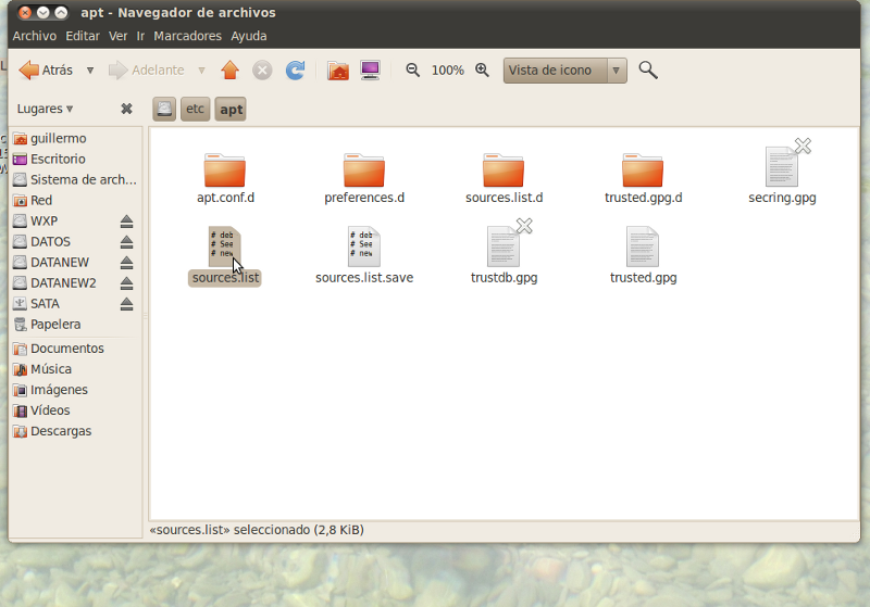 Pues bien, para poder seguir utilizando esta popular versión o distro de Ubuntu, tendremos que cambiar los repositorios manualmente, utilizando los old-release. Para ello deberemos abrir el archivo sources.list y sustituir los repositorios originales por los antiguos, los old-releases. deberemos tener permisos de superusuario (con el comando sudo su o sudo nautilus) para realizar esta acción en la carpeta /etc/apt/ de nuestro sistema. De esta forma podremos seguir instalando software en nuestro querido Lucid Lynx.