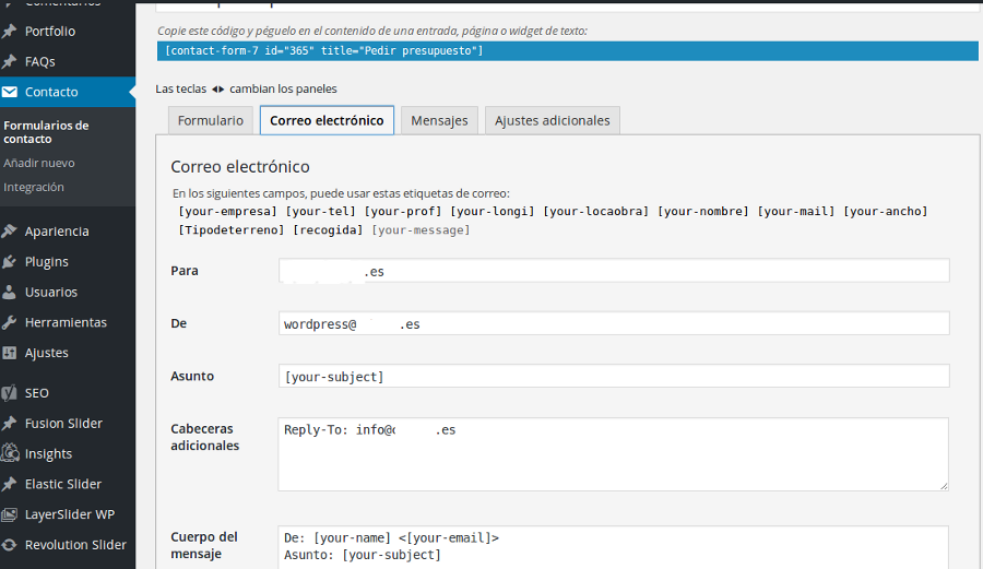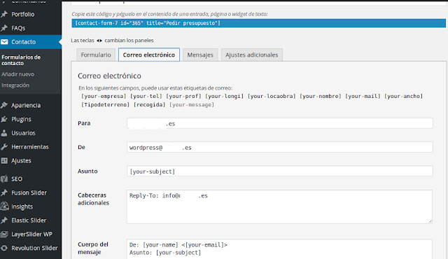 Otro de los errores que he observado es que cuando hay más de un formulario de contacto, en el segundo formulario (ya no sé si en el tercero y sucesivos), dentro también de la opción Correo electrónico, en Cabeceras adicionales, hay que sustituir Reply to [your email] por una dirección de correo electrónico de tu dominio, aunque no exista, como por ejemplo wordpress@tudominio.com (.es, etc.). A mí me han funcionado correctamente los formularios de contacto en los dos casos. Recordar que en el primero de los formularios de contacto no he tenido que cambiar la cadena Reply to [your email] en cabeceras adicionales, pero imagino que si lo hacemos tampoco pasará nada.
